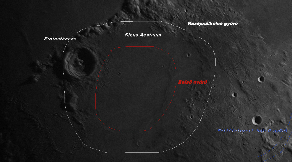 Ebből a domborzatból megmérhetjük mekkora lehetett a gyűrűje: 174km körüli.Valószínű hogy ez a belső gyűrű átmérője,mert a középső gyűrű 213km körüli.A középső gyűrű lényegében a Sinus Aestuum határa is egyben.Külső gyűrűt egyenlőre még nem azonosították a szakemberek, de a saját feltételezésem a gravitációs adatok alapján hogy kábé 300km-re délkeleti irányban egy lehetséges sáncfal maradvány lehet.A medencét létrehozó becsapódás a Hold kérgét teljesen átütötte.A köpeny feltolulását a felszakított kéregbe szintén a gravitációs mérések igazolják.