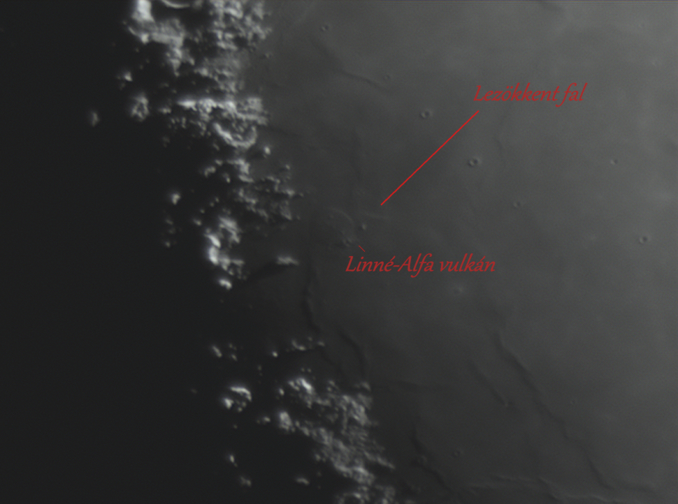 Egy nagyon nehezen észlelhető és idős vulkánt észleltem le Februárban.Az észleléshez erősen ajánlott a súroló fény.A dóm megnevezés igazából pontatlan szóhasználat,ugyanis a dóm általában meredekebb falú aránylag kis méretű vulkáni lávakúp. Az ilyen híg folyós láva által létrehozott nagyon lapos gyenge emelkedésű lávakúpot a vulkanológia, lávalepénynek nevezi. Na akkor most hogy van neve a gyereknek nézzük mi is ez! Méretileg nem kicsi,40x34km átmérőjű , magassága kelet felé 200m,nyugat felé csak 100m körüli.A legmagasabb pontja a déli féltekén található, az egész tűzhányó egy északnyugat felé lejtő felfordított lapostányér. A vulkánt átszeli egy törésvonal amelyből rövid ágak szaladnak szerteszét amolyan faágra hajaz a megjelenése.A törés csak 300m a legvastagabb részén,mélysége is csak 50m.A képemen csak a törévonal legvége látható gyengén amely befut egy lezökkent falba.A rianás a vulkán létrejöttében is segített,sőt igazából ebből táplálkozott.A Mare Imbrium,de lehet hogy a Mare Serenitatis létrejötte után a kéregben létrejött törésvonalakon nemcsak az egész terület feltöltődött lávával,(a környéken sok a kaldera és a hasadék kürtő) de a legtovább itt működött.