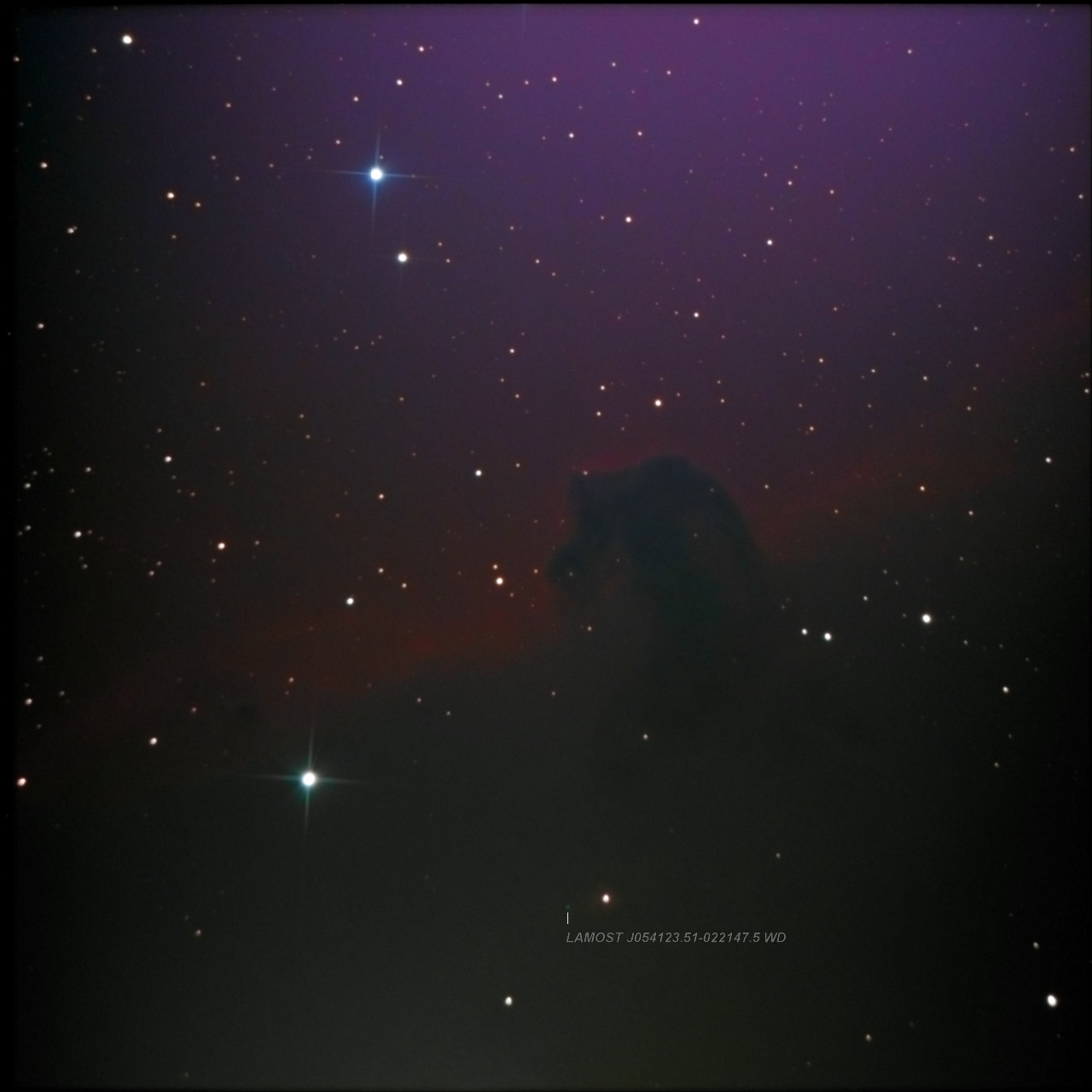 Viszont van egy igen érdekes csillag is a képemen amit egyből kiszúrtam:LAMOST J054123.51-022147.5 Fehér Törpe csillag. A halott csillagmag mindössze 488 fényévre van tőlünk.Felszíni hőmérséklete nem ismert,még csak nem rég jöttek rá a kutatók mi is ez valójában.Mivel érdekelnek a csillagok paraméterei így ennek is utánaszámoltam. A csillag 17,4m fényességű,abszolút magnitúdója +11,5M vagyis ilyen fényesnek látnánk 32,6 fényévről.Ebből is látszik hogy a Napunknál jóval halványabb (kb.:240-szer haloványabb)égitest.Átmérője 20400km és a tömege közelítőleg 0,79M° (Naptömeg).De ezek az adatok akkor érvényesek ha a fehér törpe felszíni hőmérséklete 10000K°!!! A képemen jelöltem a halott csillagot.