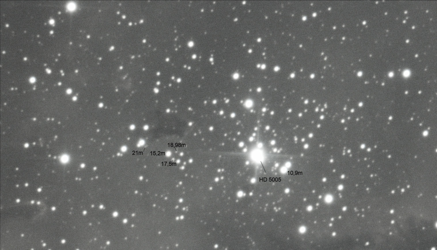 Az NGC 281 egy emissziós köd amelyet a benne megbújó IC 1590 nyílthalmaz fiatal csillagai világítanak meg és gerjesztik a gázokat fénylésre.A 9500 fényévre lévő köd-csillaghalmaz együttes 3,5 millió éves.Legfeltűnőbb csillaga egy többszörös rendszer a HD 5005. A komponensei O4.5 (45200K°) -től a B0 (29700K°) színkép típusúig terjed,a fő csillag 8,5m látszó fényességgel (ultraibolya tartományban 7,7m)a többi társcsillag ennél halványabb.A fő csillag 5554-szer fényesebb a Napnál (-4,62M), 1,2 Napátmérőjű és 11,7 Naptömegű kék óriás.Az a nagy sötét felhő amely árnyékot vet ránk (ezért sötét,a csillag a túloldalát világítja meg) mintegy 4,7 fényév hosszú és kb.: 1,5 fényév széles.Ezeket a sötét ködöket Bok-globulának nevezzük.A köd teljes mérete nem fért bele a távcsövem látómezejébe de nem is baj mert én csak egy nagyobb sötét ködöt akartam megfigyelni.Tömege 40-50 Naptömeg körüli(!) és bár rendkívül ritka átlagsűrűségű,a ködben miliméteres rádiósávban források vannak amelyek születőben lévő néhány ezer talán tízezer éves csillag kezdemények ülnek.
