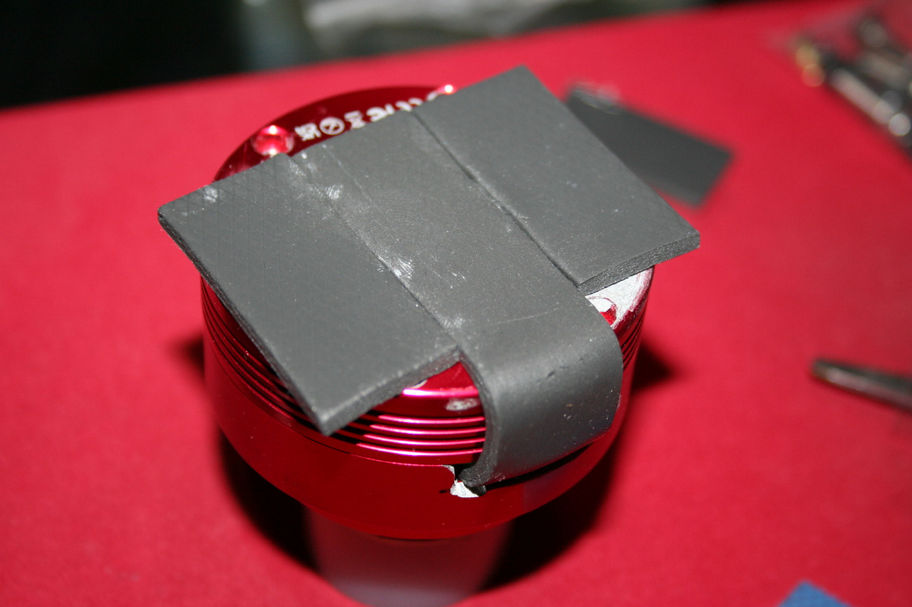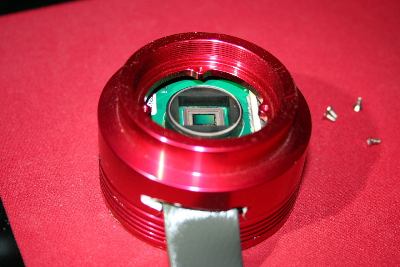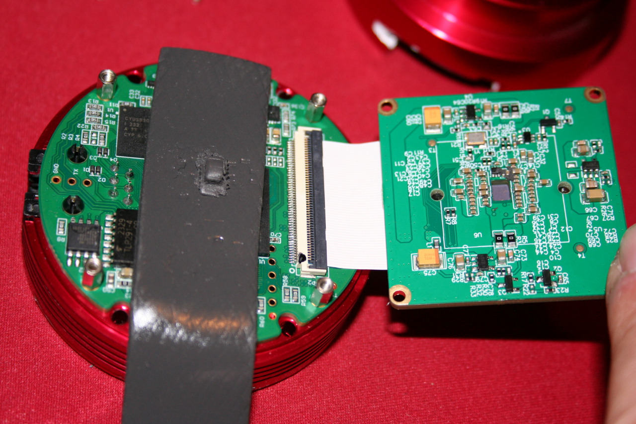 Én azért egy Peltier-hűtést raktam rá pluszba, na mondom ez megteszi a magáét. Kint élesben sajnos elég rosszul szerepelt ,a szenzor továbbra is meleg volt, néha már-már használhatatlanul magas volt a zajszint. Nem értettem: milyen spéci hűtés lehet benne hogy a külső dielektromos hűtés abszolút hatástalan? Mindössze 2,5 C°-ot sikerült hűteni a kamera szenzorán, de a külső fala az lement 15C° közelébe. Aztán szétszedtem a kamerát, megnéztem mi is van odabent. Lett is nagy rácsodálkozás! A CMOS érzékelő egyáltalán nincs hűtve (fotón láthatod) de még a kamera falához, bordáihoz sincs rézlemezzel összekötve hogy a felesleges hő eltávozzon!!! Na akkor a probléma megvan, ezt meg kell oldani. Nesze neked "hőpárna" hűtés! A megoldást hamar kitaláltam, vagy rézlemezzel kell a falhoz kivinni a hőt, vagy a gyurma állagú thermoszalaggal. A szalagnál maradtam mert is.