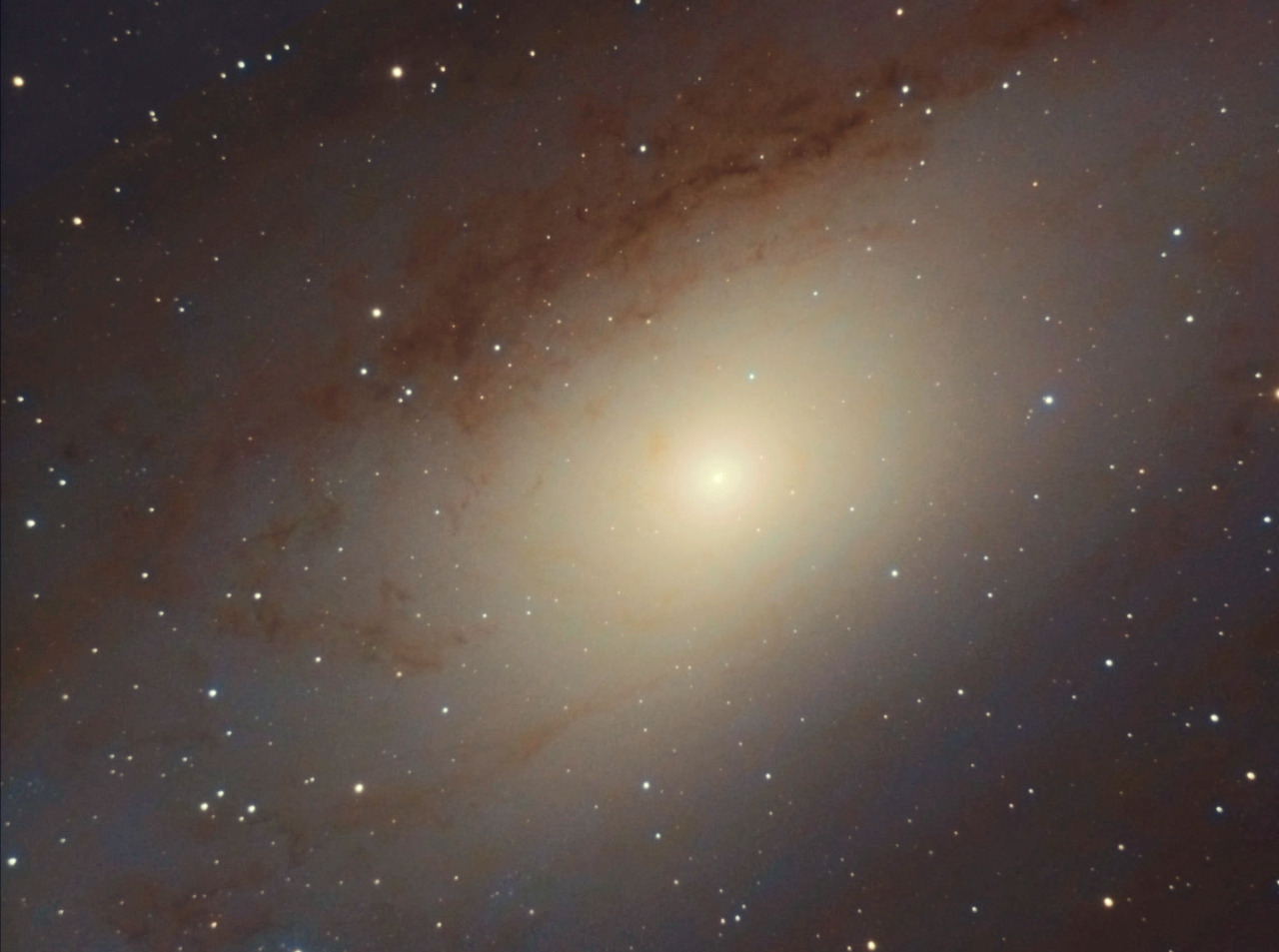 Az M31 vagy más néven Androméda-galaxis szabad szemmel is jól látható objektum.A teleholdnál 6X nagyobb teruletet foglal el az égen, miközben 2,5 millió fényévnyire van tőlünk.A felvételemen a belső területét láthatjuk,a magot és az ahhoz közel lévő karokat illetve mivel ferdén látunk rá a galaxisra, az átfutó külső karokat is.Jól látható hogy a külső régiók porban gazdagok,a markáns sötét molekulafelhők beszédesek.A mag II. populációs csillagai sárgás fényűre festik a központi részt, ezek öreg 12 milliárd éves csillagok amelyekben a nehéz elemek csak alacsony szinten találhatóak.A nehéz elemek a csillagok élethosszát jelentősen befolyásolják: minél több az ilyen "szennyezőanyag" a csillag élete annál rövidebb.A csillag élete során maga is nehéz elemeket épít fel a magjában de az itt tárgyalt nehéz elemek már születésüknél fogva jelen vannak vagy hiányoznak.A mag legbelső vidékein azért vannak fiatal I.populációs csillagok is.Ezek a csillagok még rejtélyesek a csillagászok előtt,hiszen a fekete lyuk környezetében eddigi ismereteink szerint nem tudna csillag születni.A működő fekete lyuk olyan mértékben fehevíti a környezetében lévő gázokat hogy azok nem tudnak összeállni csillagokká,ráadásul ezeket a gázokat el is szokta fújni a galaktikus halo térségeibe.Persze az is hozzátartozik a dolgokhoz hogy a gázok folyamatosan áramlanak be a spirálkarokból a magba,ezek egy része behullik a fekete lyukba táplálva azt. A csillagkeletkezésnek ez a folyamata még megértésre vár.Az Androméda-galaxisnak dupla magja van.A két mag mintegy 5 fényévre van egymástól,ami nem nagy távolság.A kettős mag magyarázata (korábban egy felfalt törpegalaxis magjának gondolták) az hogy egy 140 millió naptömegű szupermasszív fekete lyuk körül 5 fényév távolságban keringő csillagok legnagyobb távolságukban lelassulnak,látszólagosan feltorlódnak a pályájuk ezen szakaszán.Ennek a jelenségnek olyan vizuális hatása van mintha két maggal rendelkezne a galaxis.Sajnos a felvételemen ez nem látható.