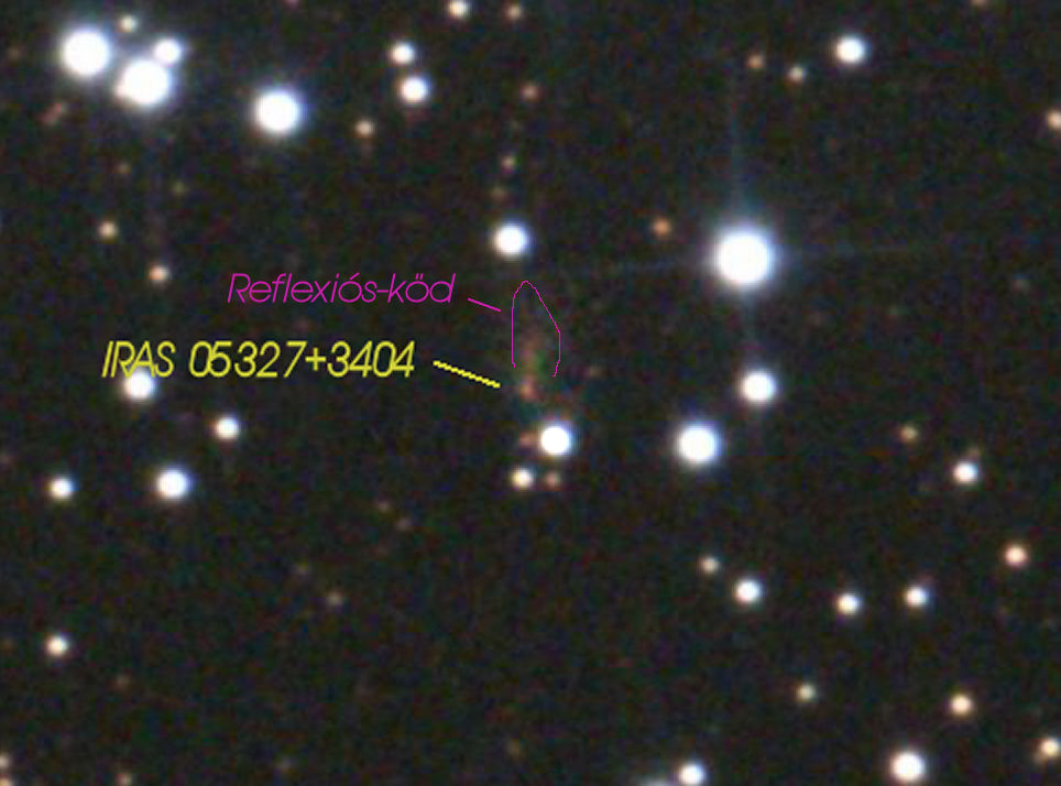 A II.osztályú YSO fél-egy millió év körüli lehet.Infravörösben mintegy 7m-val fényesebb az objektum,ennek oka hogy még mindig sok por és gáz veszi körül a protocsillagot amely a rövidebb hullámhosszakat eléggé tompítja.A protocsillag korongja már lapos fánk alakú a közepén egy 32 Fok kúpnyílású ritka térrésszel.Ez az "üres" térrész lehetővé teszi hogy ebbe az irányban a csillag fénye jobban kijusson.Ennek következménye az a megvilágított felhőfoszlány amely mint egy kis gyertyaláng látszólagosan merőlegesen áll a protocsillag korongjára.Ez a gázfelhő nem tartozik a protocsillaghoz attól messzebb van,csak a narancs színű protocsillag megvilágítja,annak fényét veri vissza.Lényegében ez is egy narancsos reflexiós-köd. Saját számításaim szerint 0,41 fényév körüli a látszó mérete de ez a bizonytalan távolság adat miatt hibával terhelt.A protocsillag 4900-5000K° hőmérsékletű, K2 színképtípusú, III. luminozitás osztályú (szubóriás).A számítások azt mutatják hogy 1,3 Napátmérő körüli az előcsillag, 0,87L° a fényteljesítménye, abszolút magnitúdója +4,88M.A nagy pormennyiség miatt ez megint csak pontatlan számítás (korrigált értékekkel számoltam).A tömege a csillagnak megint csak kérdéses.A halmaz kora megmutatja hogy mekkora tömegű az a legkisebb csillag amely elérhette az összehúzódás állapotát.Bár az elméletek szintén hibával terheltek de 1-1,5 Naptömegű lehet.Valószínűleg a hidrogén égése most vagy mostanában indult be.Természetesen a "most" szót csillagászati értelemben kell értelmezni (+/- 200000 év).A fúzió beindulása és a gravitációs összehúzódás összenergiája a protocsillagot felfújja egy kicsit, feltételezem(!) hogy ebben a stádiumban van.Később mikor csak a fúzió adja az energiát a csillag kicsit "összemegy",de ez még odébb lehet.Az IRAS 05327+3404-nek van társa is, tőle 6"-re nyugatra (0,75 fényév) amely vizuálisan nem látható.