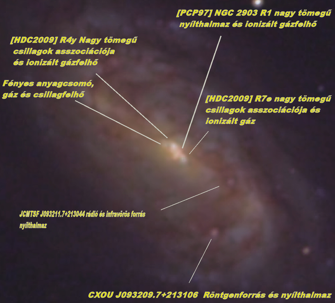 A nagy mennyiségű gázok azonban még nem értek el a központi fekete lyukhoz,a 9 millió M° (Naptömegű) objektum egyáltalán nem aktív de ez a jövőben változni fog.Az NGC 2903 R2 és R1 szuper nyílthalmaz tömege százezer és egy millió naptömeg között lehet.Ez azt jelenti hogy akár gömbhalmazok is keletkezhetnek belőlük! A galaxis rotációjának helyenkénti kis eltérése a legjobb bemutatója a sötét anyag hatásának.Erről közlök ide egy képet.