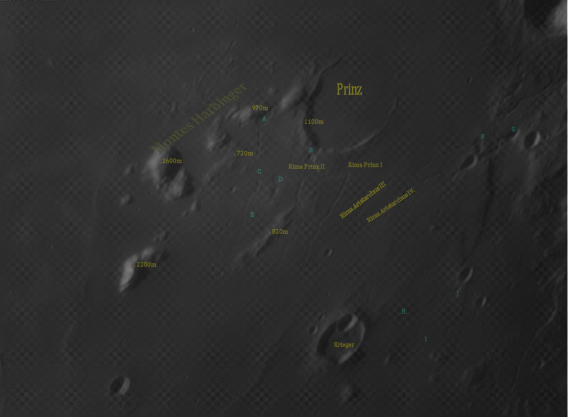 A látómezőben uralkodó a Prinz kráter (46km átmérő) ami legalább Nektári korú (~3,9 milliárd évnél öregebb) csak a legmagasabb pontjai látszódnak ki,szerencsétlen krátert többször érte trauma.Egy alkalommal az Imbrium-medence keletkezésekor a kilökött anyag fedte be,utána pedig a gigászi erejű vulkanikus erők által korbácsolt láva folyta körül és öntötte el.Plusz érte még tortúra mikor is a már említett Imbrium-medence keletkezésekor a pusztító erők ledarálták a kráter csúcsait.Emiatt is látszik letisztultnak a sánc.A krátertől balra lefelé ha elindulunk, a felszínből aránylag meredeken kiugró hegyekkel találkozunk.Ezek a képződmények viszont az Imbriumi-medence egyik legnyugatibb falának maradványai! A legérdekesebbek viszont a rianások.Mivel a környék igen aktív volt, nehéz pontosan megállapítani hogy lávafolyás vagy tektonikus mozgás hozta létre ezeket a formációkat,de valószínű hogy egyszerre a kettő alakította.A felvételemen látható hogy közel derékszögben is van törés egyes csatornákban ami abszolút nem jellemző a lávafolyásokra.Szondás felvételeken viszont látszik hogy pl.:a Prinz I-ben a rianás alján lávamosás,még egy meder található.Szépen megfigyelhető ahogy elfogy a láva úgy csökken az erózió és laposodik el a csatorna, lesz egyre sekélyebb.A környék hemzseg a beszakadt lávakamráktól,kalderáktól.A képemen betűvel jelöltem őket.A legnagyobb az A jelű 7kmX5km mérettel rendelkezik de nem ez a leghosszabb! Sajnos elég gyengén látszik a képemen az E jelű, pedig 8,8km hosszú! A másik érdekes forma a Krieger-kráter.A kráter közepéből kifelé egy 36km hosszú árok fut ki.Tipikusan vulkáni megjelenés,még szigetek is vannak amiket körbeölel a meder.Csakhogy a probléma ott kezdődik hogy a kráter sáncát fölfelé hogyan mászta meg a magma? A Prinz rianásoknál sem ritka az hogy akár 45m-es emelkedőt is leküzdött a magma! A magyarázat a lávacsatorna illetve maga a lávacső. Ugyanis közlekedőedényként működve a nyomás átsegíti a magaslaton az olvadékot.Arra kell csak ügyelni hogy a forrás magasabban legyen mint az akadály.Később ez beomolva csatorna lesz és a szakik vakarják a fejüket: ezt hogy csinálta?! A rianások falai 8-24 fok dőlésűek,mélységük maximum 300m, alakjuk(metszetük) a klasszikus V alakra hasonlít.